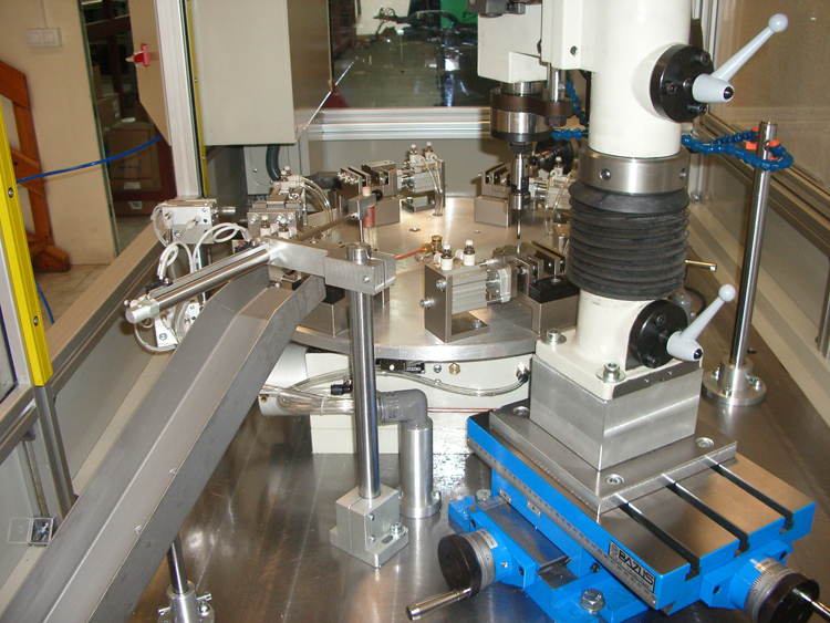 Máquina automática rotativa con plato indexador portautillajes con intercambio de modelo rápido. Plato indexador con elevador de alimentación de pieza. Salida y extracción por cinta transportadoraa. Pulmón rotativo de alimentación de piezas, sistema de vibración externo. Alimntación de pesos y plásticos porta rosca. Incorporando sistema de encolado automático. Control de la máquina por pantalla táctil.