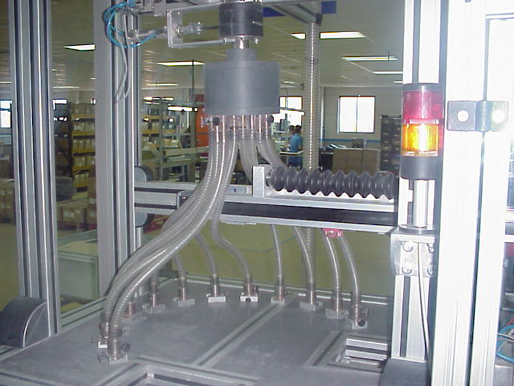 Sistema de llenado de arena rotativo automático, con utillajes de colocación de fusibles NH, vibración y captación de arena